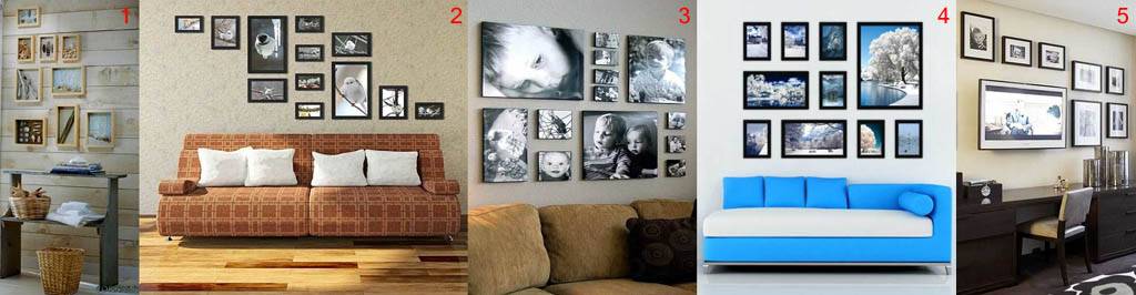 Картины/фото на стенах развешивают в художественном беспорядке в интерьерах классических или традиционных, поз. 1 на рис. В современных интерьерах композиции изображений хорошо смотрятся скомпонованными симметрично.