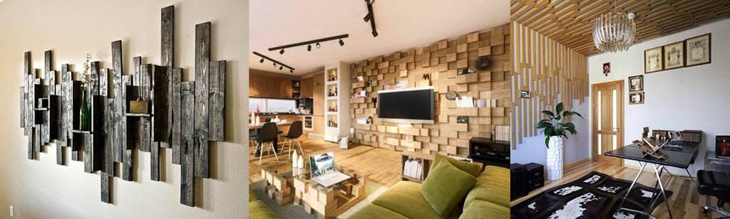 Другой бросовый материал для декора стен и потолка практически в любом интерьере – доски от старых строительных поддонов, паллет, см. рис. Крепить деревянный декор к стене лучше всего отрезками велосипедных спиц, вогнанных в пластиковые дюбели для мелких саморезов: при необходимости деревяшка просто снимается, а если вынуть шпенек, то и отверстие в стене почти незаметно. Допустимая нагрузка на 1 крепление (штырь выступает не менее чем на 1,5 см) – до 7 кг.