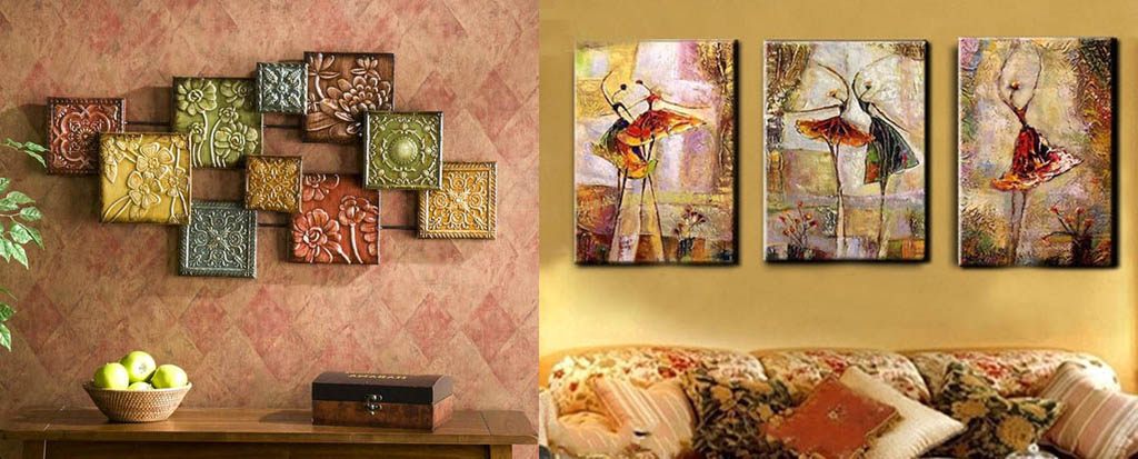 Эстетика накладной лепнины и навесных панно сходна, несмотря на большие внешние их различия. Лепнина более подойдет в гостиную или детскую, т.к. на любой стене прекрасно сочетается с картинками и накладной мелочью, слева на рис. Панно хорошо расслабит с спальне, в центре. Изюминка в данном случае – то ли вышивка, то ли набивка по трафарету в углу средней панели.