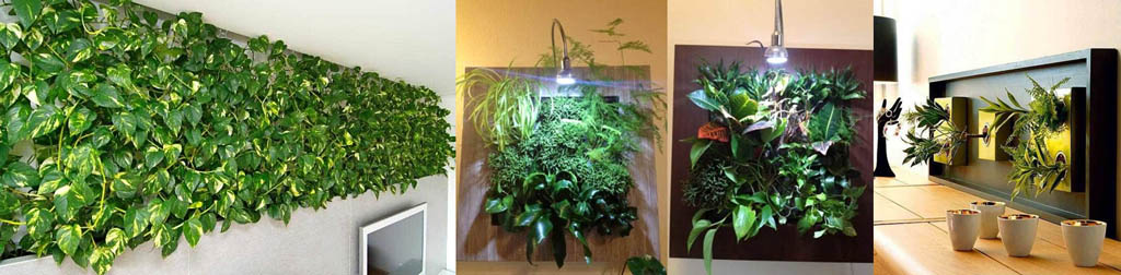 К разряду «деревянного», т.е. экологичного натурального, можно отнести и растительный декор стен. Потолочный бордюр из плюща или настенные вертикальные клумбы/вазоны (слева и в центре на рис.) довольно сложно вырастить и содержать,однако искусственными растениями достаточно высокого качества можно задекорировать стену пусть не на всякий вкус, но оригинально и выразительно, справа на рис.