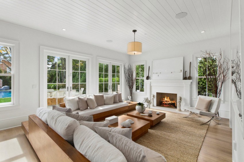 Широкие окна или проемы от пола до потолка создают ощущение легкого воздушного пространства, что немаловажно для небольших гостиных. В отделке предпочтение отдают натуральным светлым оттенкам: кремовым, светло-горчичным, нежно-лиловым, пепельно-белым