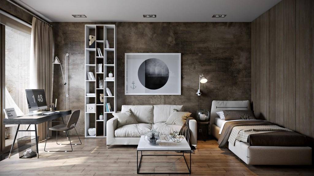 Если необходимо обустроить студию, то уместно будет освободить пространство от крупной корпусной мебели. Больше воздуха и невесомости. Часто обои и ковры выбираются без рисунка. Вместо этого изделия усложняются при помощи интересных фактур.