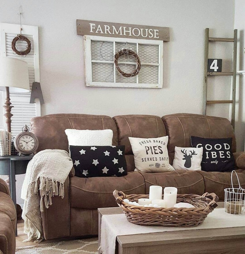 - Декор стен в сельском стиле оформить проще всего. В гостиной можно поместить сделанные вручную и расписанные тарелки, глиняные вазочки с цветами. Красиво будут смотреться веревочные изделия. Мебель выбирают спокойную, без наличия кричащих цветов и дополняют дизайн вышитыми подушками.