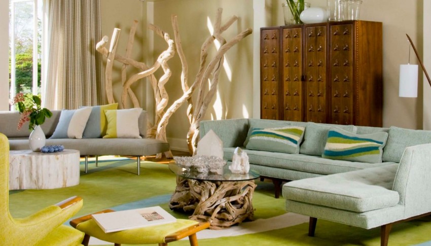 Гостиную в стиле поп-арт можно украсить статуэтками в стиле 60-х, а полки в эко-стиле украсят вазы из необработанной глины.