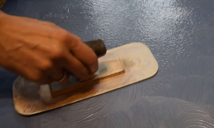 - Прежде чем раствор застынет, нужно пригладить поверхность пластиковым шпателем. В процессе излишки состава будут собираться на его рабочем крае, их нужно удалять чистой тряпкой.