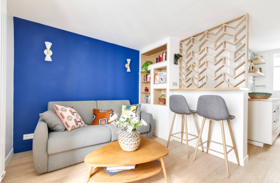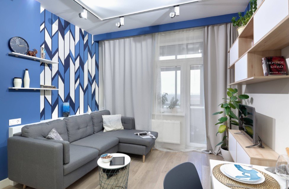 Для придания помещению большей высоты и ширины рекомендуется окрашивать стены, пол и потолок в светлые оттенки. Это добавит не только объема, но и «воздуха» в комнату. Белый, молочный, нежно-голубой – вот тона, которые отлично смотрятся в декоре однокомнатных квартир. Чтобы интерьер не был скучным, следует добавить цветовых акцентов – ярких пуфов, подушек, светильников.