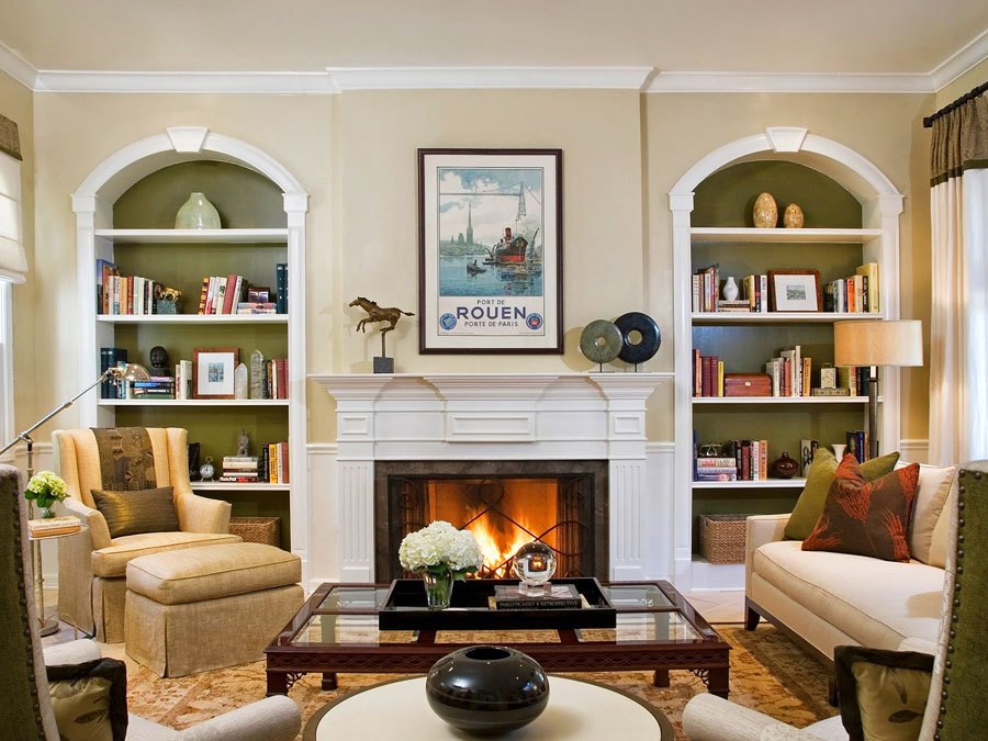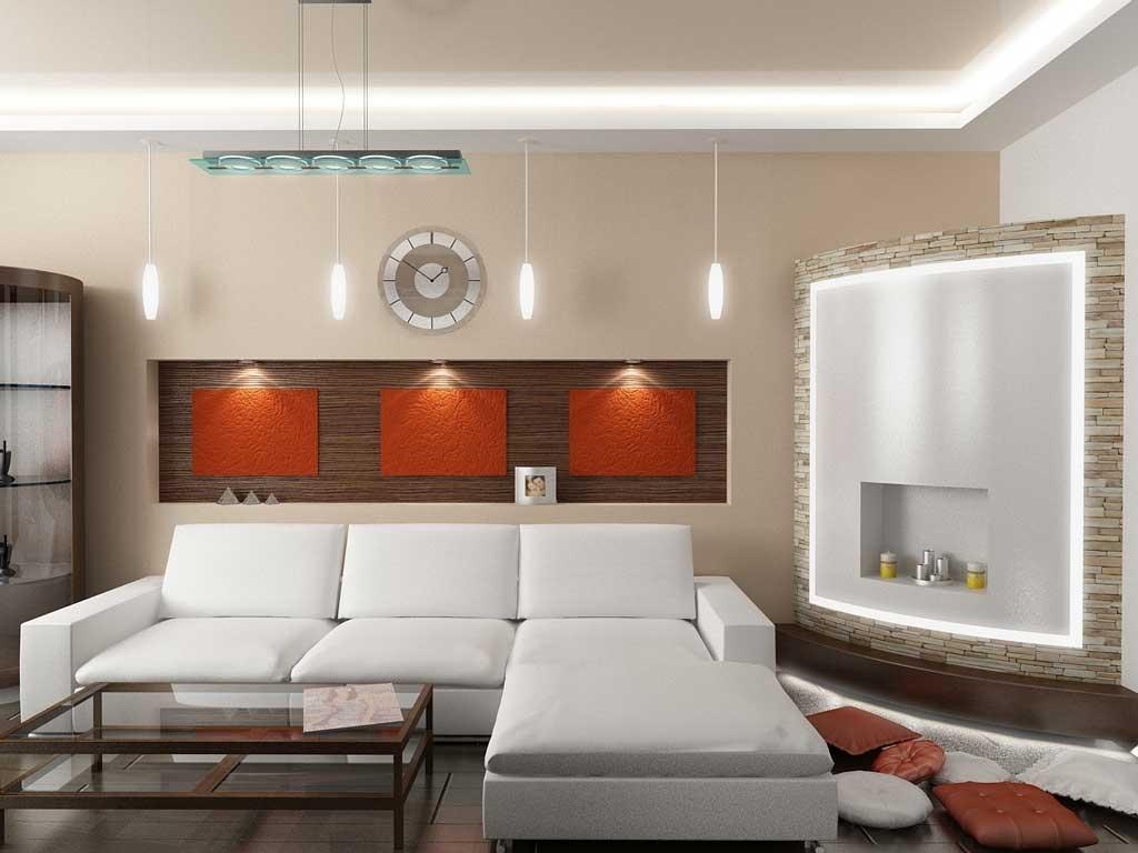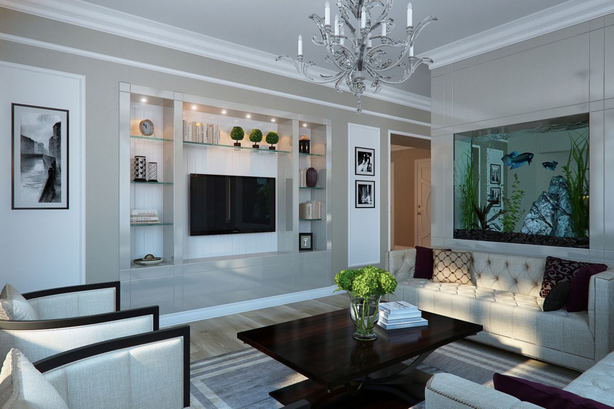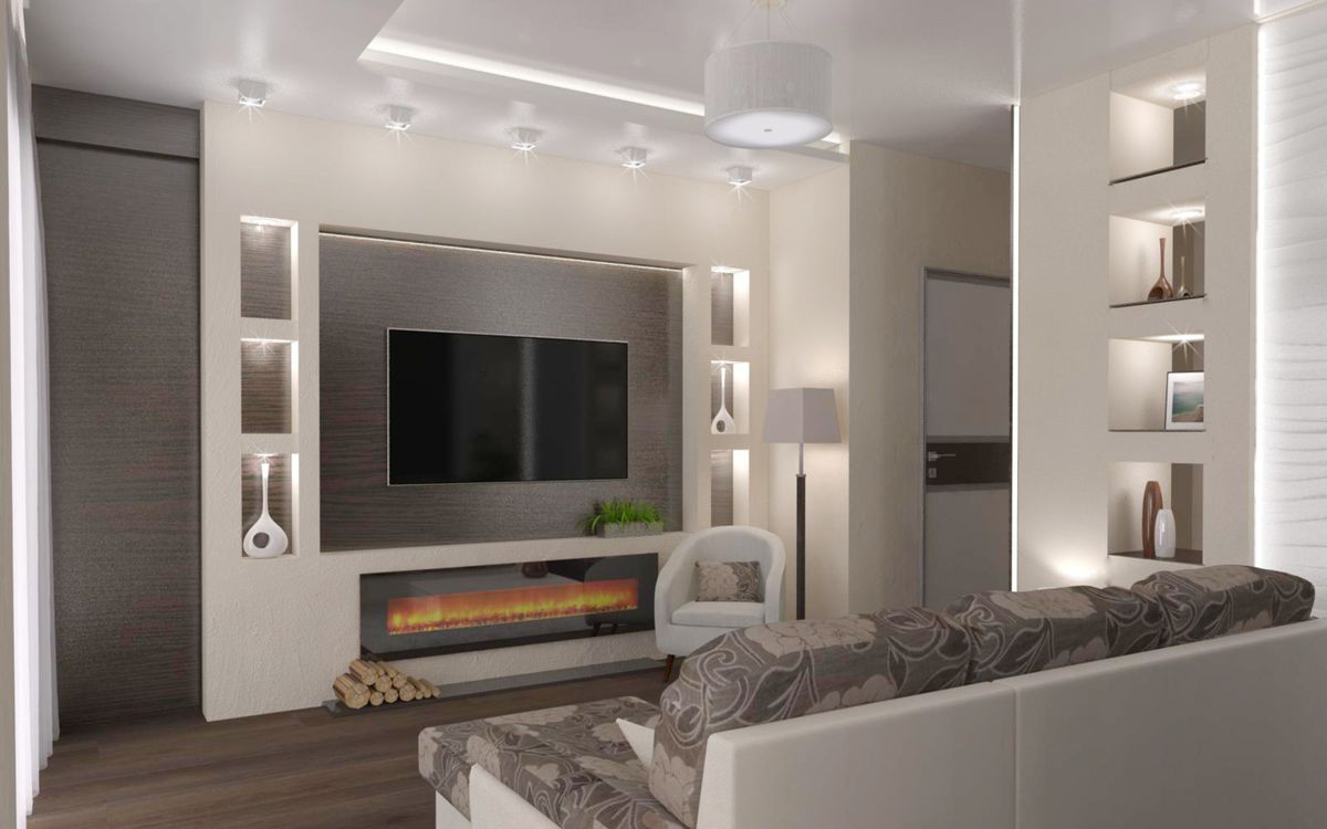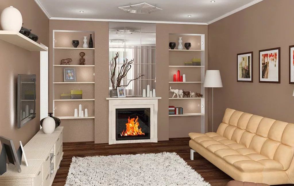 Гостиная – большая центральная комната в квартире или доме. Углубление, созданное в стене, используют для установки декоративного камина, под телевизор, аквариум. Иногда оно служит полками для книг или фоторамок с редкими фото. Полки выделяют из общего фона помещения отличными материалами и цветами. Нередко оформление производят 3D-элементами: