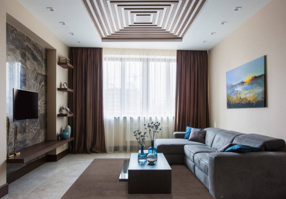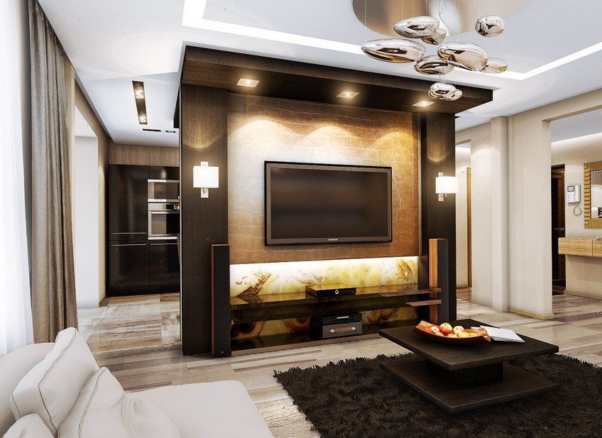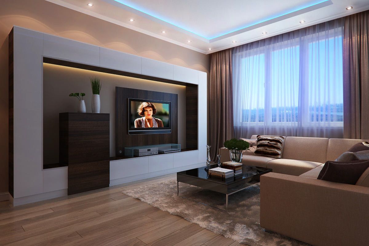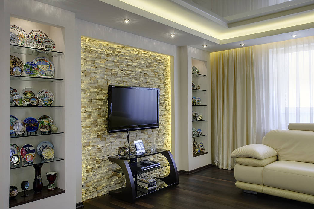Стеновые полотна, имеющие маленькую длину, лучше украсить горизонтальными нишами, которые визуально будут вытягивать стены. Подобные углубления используют как нишу под телевизор.