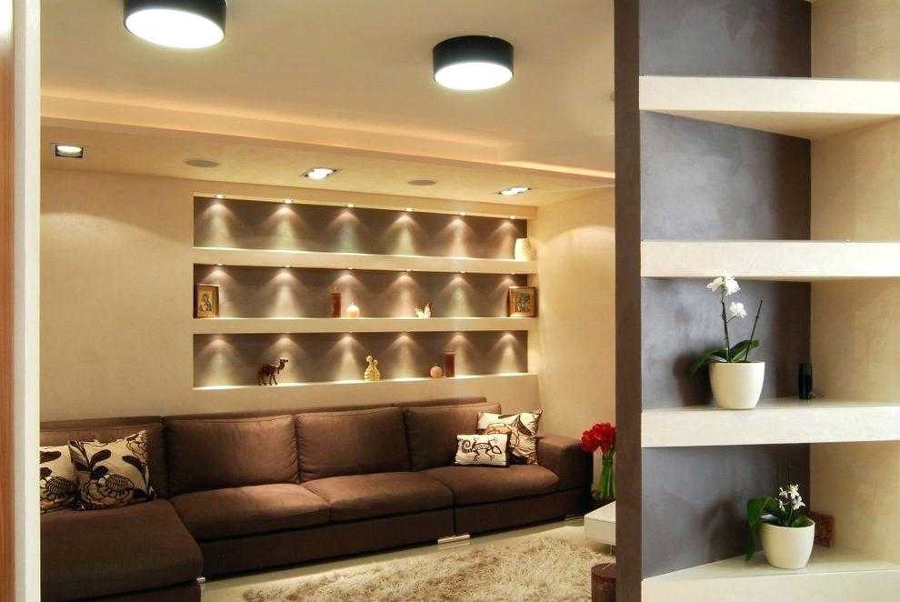 Если помещение очень небольшого размера, то попробуйте встроить в нишу в диван или кресла. Это будет интересно и понравится всем. В большую нишу можно встроить даже кровать или шкаф. Если закрыть нишу, то получится отдельная комната. Попробуйте подсветку разных цветов.