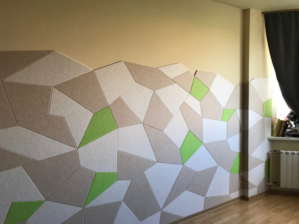 Среди них особо выделяются мягкие стеновые панели из фетра, которые представлены на рынке в виде плитных и рулонных изделий. Монтаж вторых производится с использованием специального клеевого состава и мало чем отличается от оклейки стен обоями.