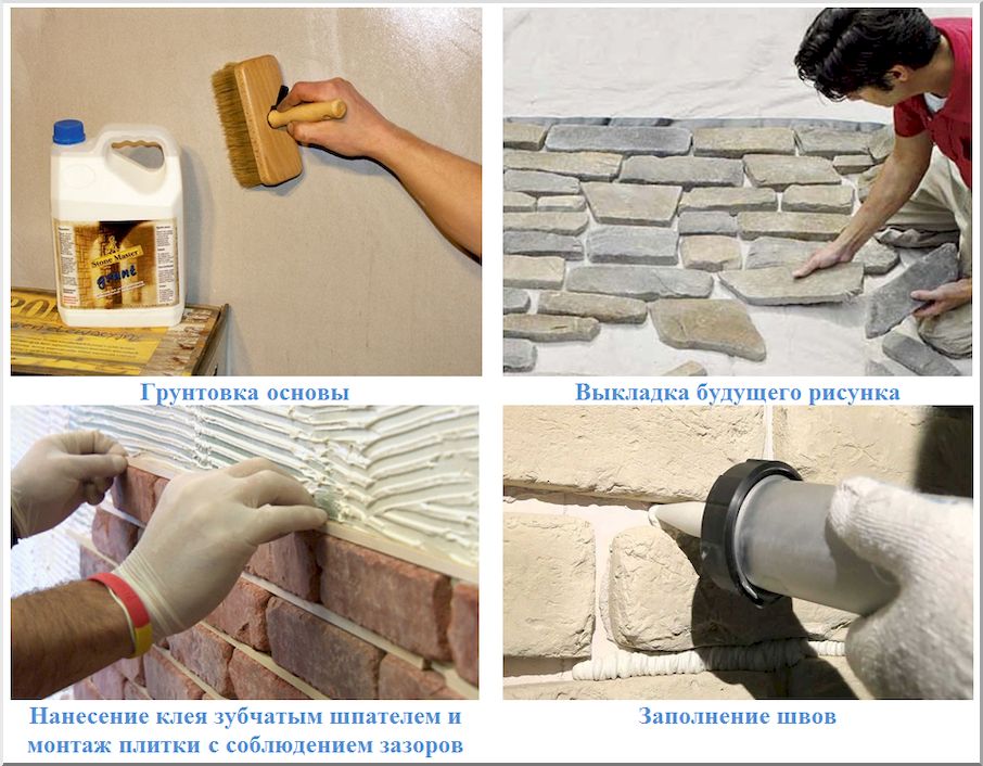 Независимо от выбранного варианта облицовочный камень для внутренней отделки имеет похожую технологию укладки. Она включает в себя ряд последовательных этапов: