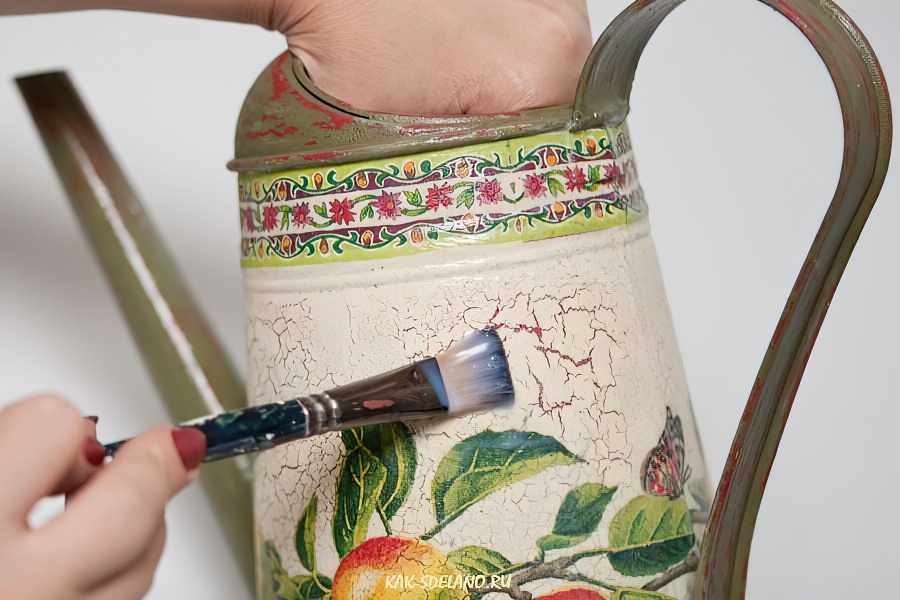На завершающем этапе, сделанный декупаж тканью покрывают специальным аквалаком.