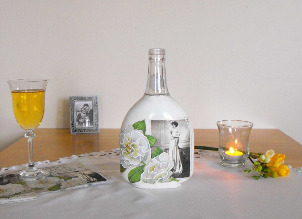 После обычного прямого декупажа, приступаем к созданию драпировки. Разберём декупаж бутылки для начинающих, пошагово, с фото. Для этого колготки нужно замочить в растворе из клея ПВА и воды (1:1). Теперь одеваем колготки на бутылку, оставляя место, где находится картинка. Осталось сформировать красивую драпировку и просушить её, можно сделать это феном.