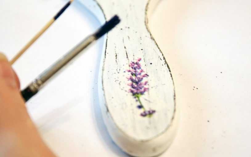 Затем, берется краска на основе акрила нужного тона, с помощью которой осуществляется подкрашивание определённых участков вблизи наклеенного мотива. Также здесь вы можете нарисовать дополнительные элементы. В данном мастер-классе это листья.