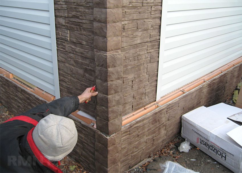 - Деталь фиксируется по нижнему краю строения или по отливу, если отдельно создается цокольный участок (его обшивка практически идентична работе с фасадом).