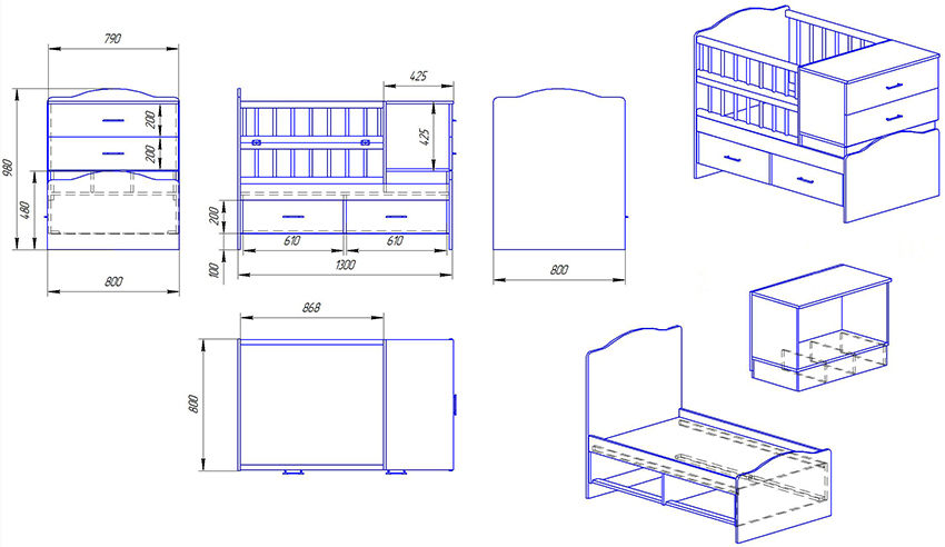 Размеры ножек высчитываются для получения надежности и прочности для детей. Чертежи дают точные описания их сборки. Но их внешний вид очень важен, они изменяют весь стиль мебели.