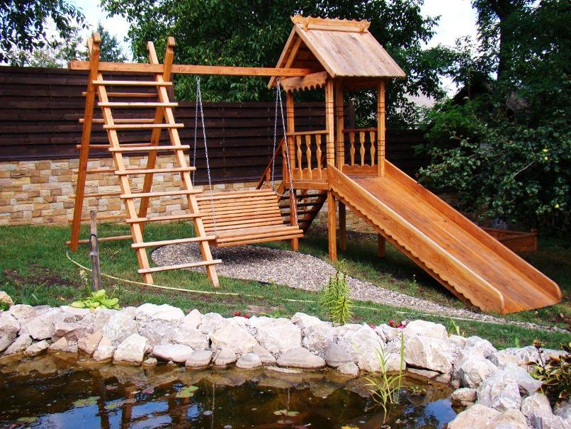 Проще всего сделать постройку из дерева. Если добавить несколько элементов из цепей и каната, получится полноценный уличный комплекс для развлечений. Представленный вариант сильно выиграет, если его оживить разноцветными красками.