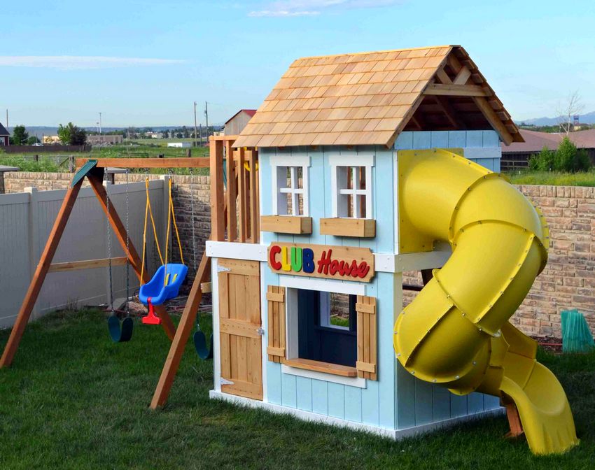 Деревянная горка с двумя спусками, домиком и качелями, построенная во дворе частного дома