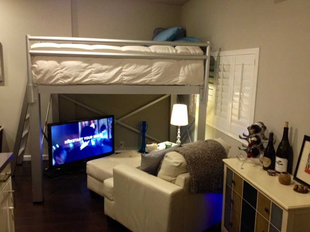 Кровать с чердаком решает проблему выбора: диван или кровать? В студиях жилая комната выполняет роль кухни, столовой и гостиной, поэтому логично поднять спальное место вверх и не привлекать к нему внимания гостей. Диван может идти в комплекте с кроватью-чердаком, либо для него оставляют свободное место под спальным ложем.
