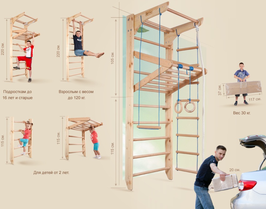 Важно определиться, что вы хотите включить в состав уголка. Как правило, основным элементом является шведская стенка, установка которой всегда производится в первую очередь так, как она занимает больше всего места