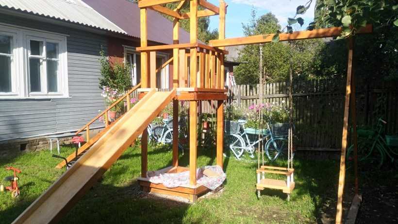 Горку удобно устраивать из готовых деревянных или пластиковых деталей, которые должны быть разноцветными. А если одного спуска недостаточно, то к горке крепится перекладина для качелей и лестницы, идущей под острым наклоном. Часто детская площадка во дворе своими руками располагает горкой, которая пристроена к беседке.