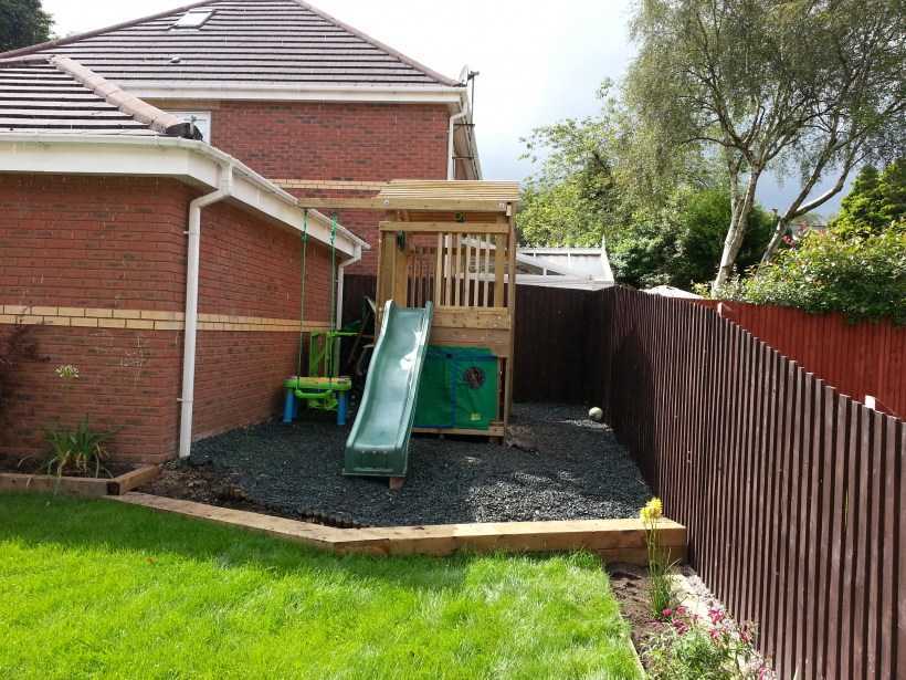 С нагрузкой от игр подросших детей газон уже не справляется. Особенно в зоне активных игр: возле горок, качелей. Это самые проблемные участки. Если оставить эти участки «как есть», то во время дождя под ними образуется лужа, через пару «заездов», превращающаяся в болото. Есть неплохое решение: сделать дренирующую подушку из щебня, а поверх нее засыпать песок или уложить резиновое покрытие типа того, что используют на стадионах. Оно долговечно и прочно.