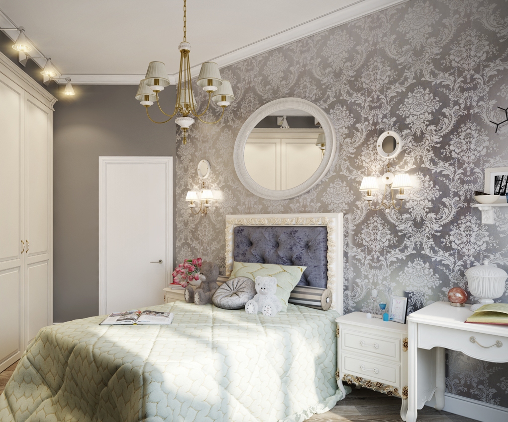 Для юных девушек классика актуальна. Изображение на обоях должно быть элегантным и аристократичным. Здесь лучше всего подойдет дамасский рисунок (вензеля, огурцы, орнамент). Настенные покрытия в комнату для девочек желательно подбирать в светлых или пастельных тонах.