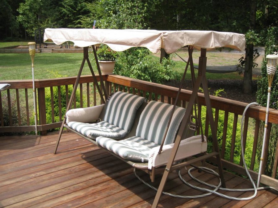 Убедитесь в надежности соединений и принимайтесь за декоративное оформление, кроме покраски можно соорудить тент на верху рамы. Сшейте чехол для садовых качелей, и надевайте его на конструкцию, когда вы ею не пользуетесь. Благодаря этому вам удастся сохранить первоначальный внешний вид в течение долгого времени.