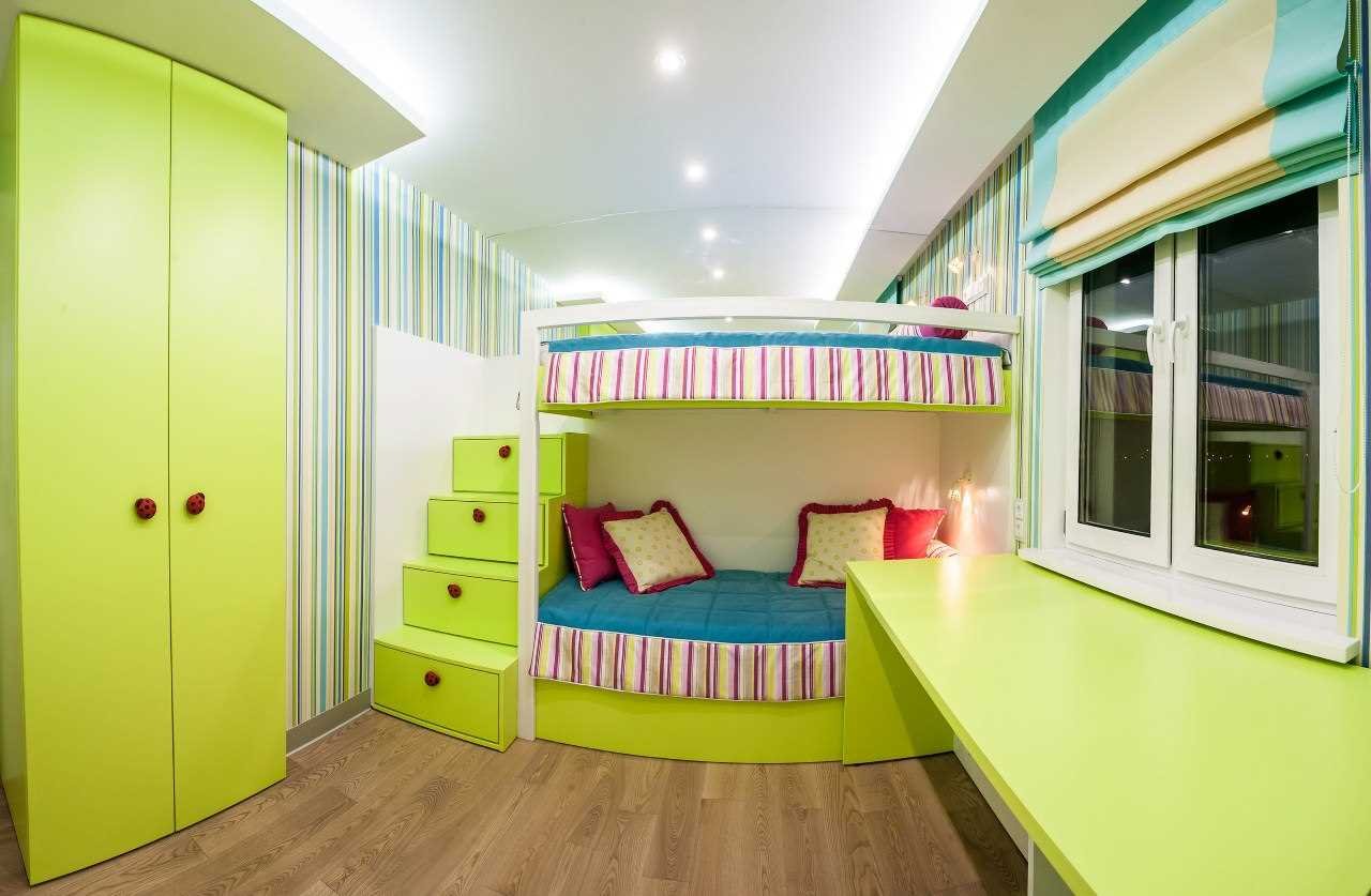 Размещение в комнате двоих детей предполагает использование современной многофункциональной мебели с возможностью трансформации или двух ярусных кроватей.