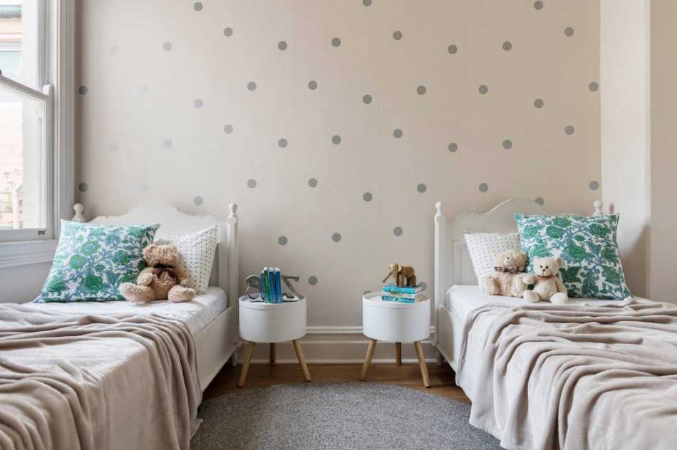 Комнату двух разнополых детей можно разделить на две части плотными шторами, создающими эффект театрального занавеса. Это позволит детям в любой момент побыть в уединении на своей части комнаты, а также спокойно заниматься своим гардеробом.