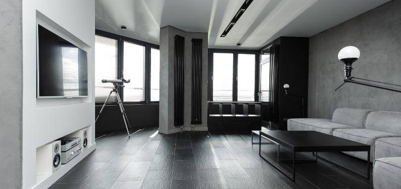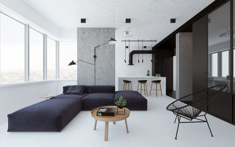 Фоном для стиля служит белый цвет. Контраст ему составляют базовые черный и серый. В интерьере много металла и стекла.