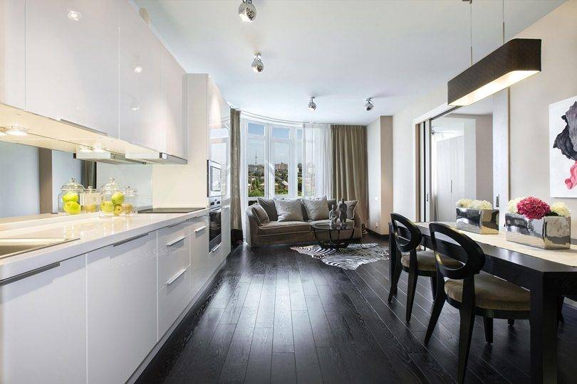 Отделка и оформление поверхностей поможет не только украсить интерьер, но и создать желаемый эффект расширения пространства. Контрастное оформление белого потолка с легким глянцем и темного пола станет оптимальным решением для небольшой жилплощади 44 кв метра. Подъем пола, или комбинирование различных материалов органично подчеркнут дизайн и раздел помещения на зоны.
