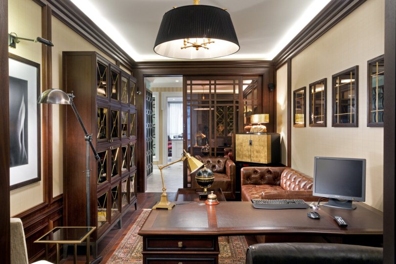 Создан для любителей симметричности, ему свойственна элегантность. Цвета преобладают темные: шоколадный, зеленый, коричневый. Вся мебель выполнена из ценных пород дерева.