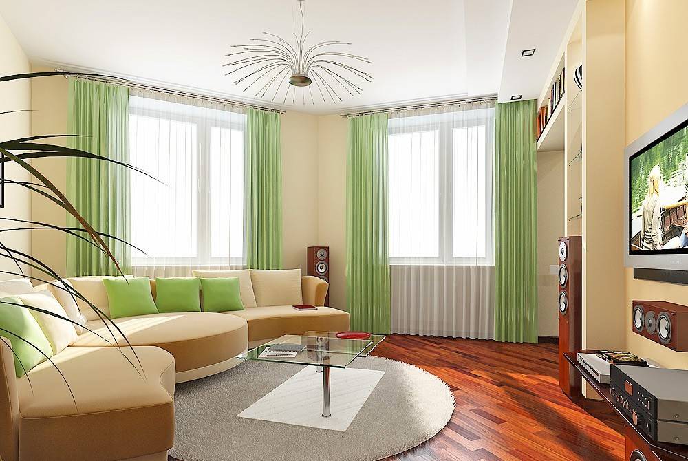 Отделка зала с двумя окнами