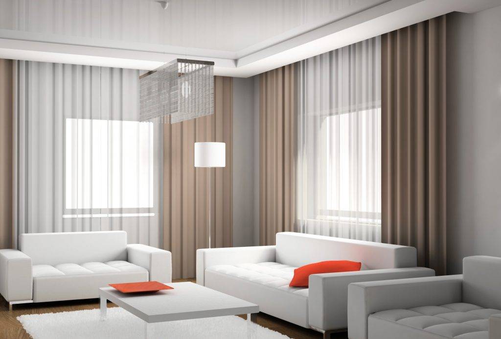 Отвлечь внимание от окон поможет идеальная согласованность текстиля. Используют одинаковые шторы в гостиную на два окна