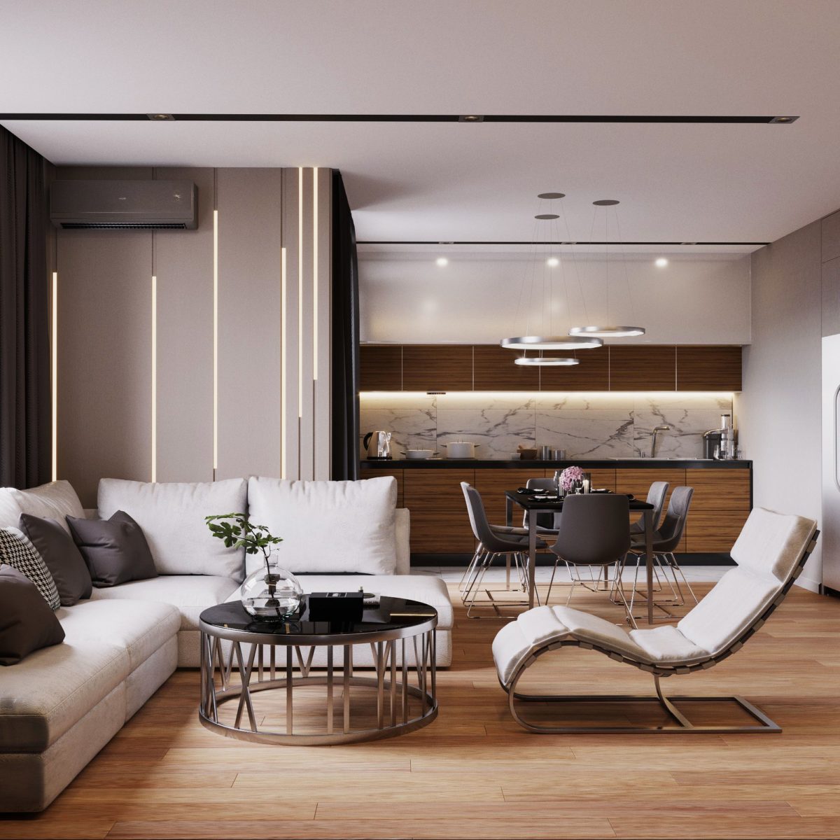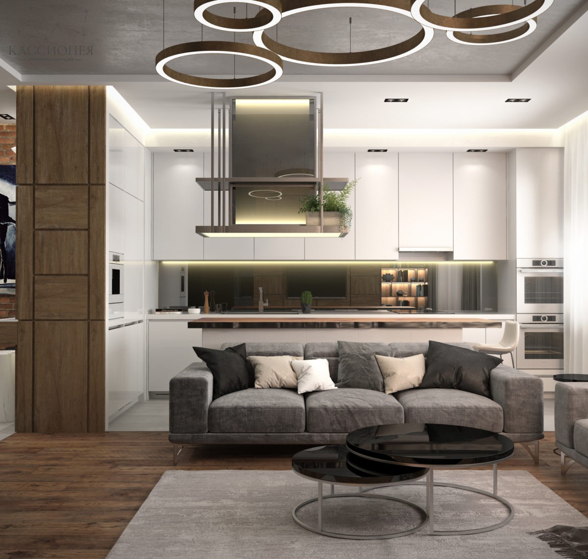 Интерьер кухни-гостиной 30 кв. м: минимализм в большой комнате