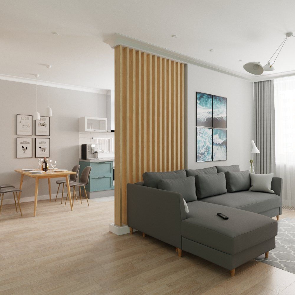 Легкая перегородка отделяет зону кухни и гостиной, не загораживая при этом помещение