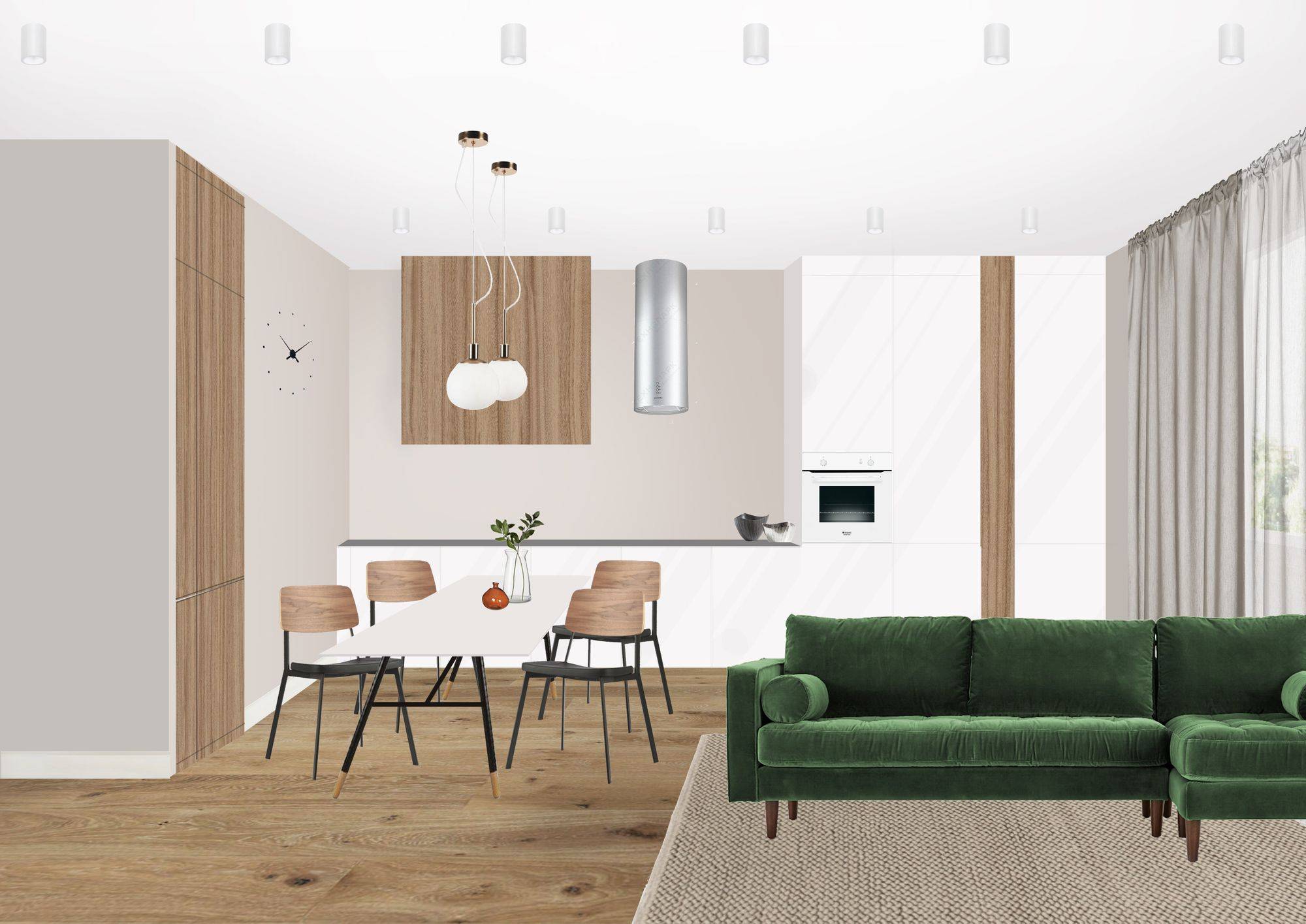 - Выделить получившуюся столовую зону и создать световую «завесу» поможет дополнительное верхнее освещение.