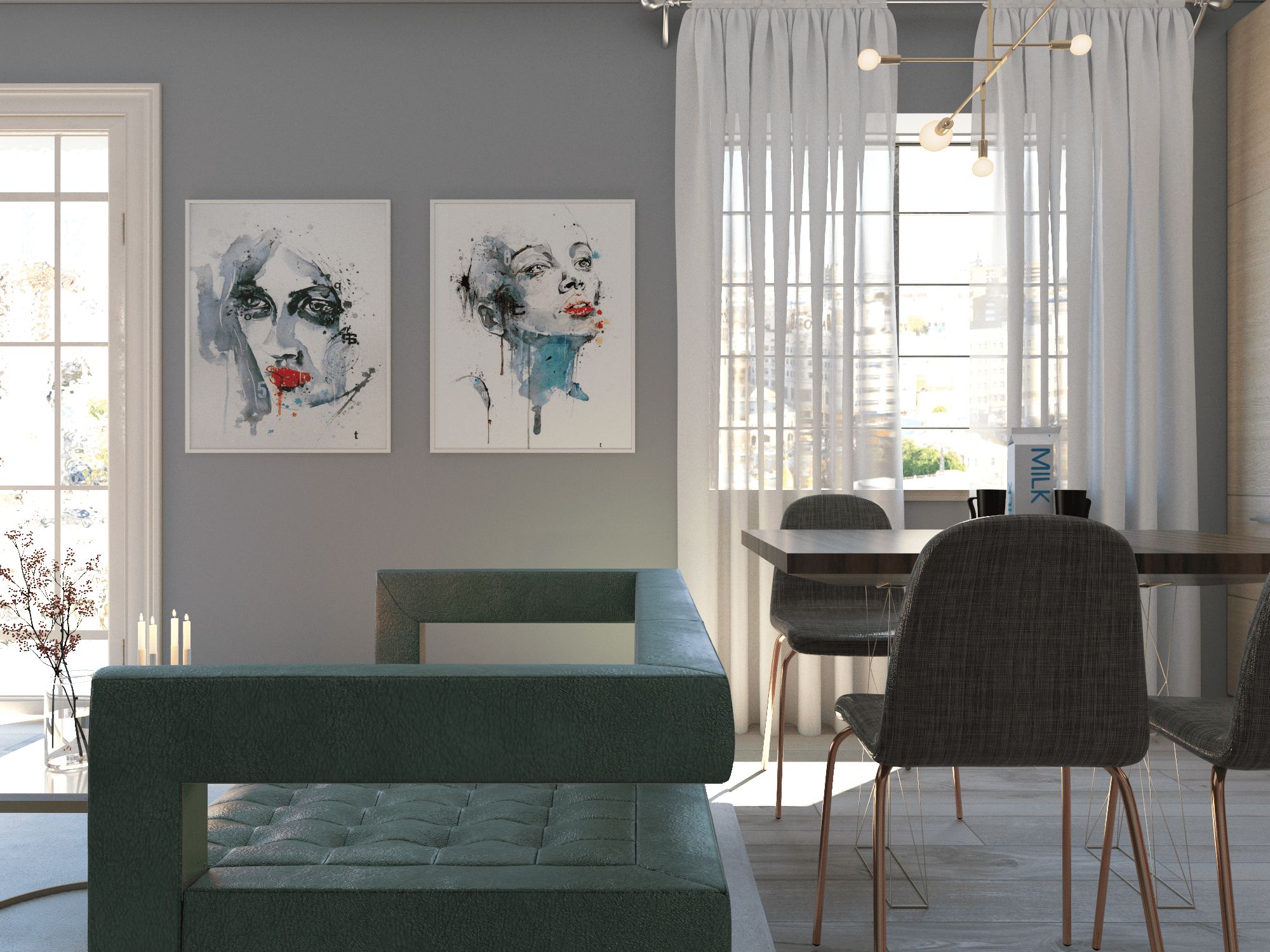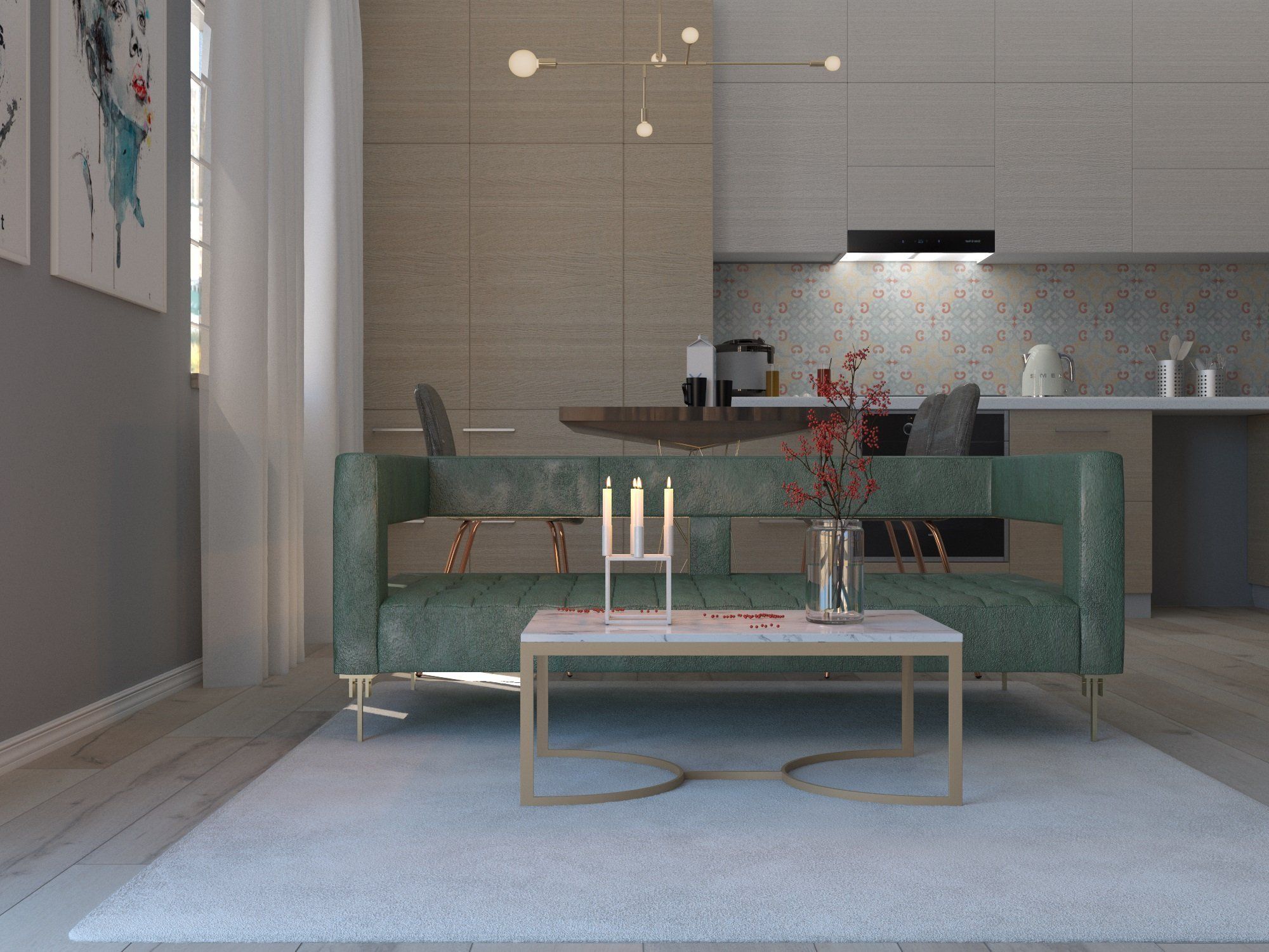Представьте, будто бы в классической кухне, совмещенной с гостиной. Теперь вы ассиметрично растягиваете двери и мебель, придав им изогнутых форм, добавляете витражей вместо стекла, оптических иллюзий на стены и потолок, делаете главенствующим сочетание белого и голубого цветов. Вы почти у цели!