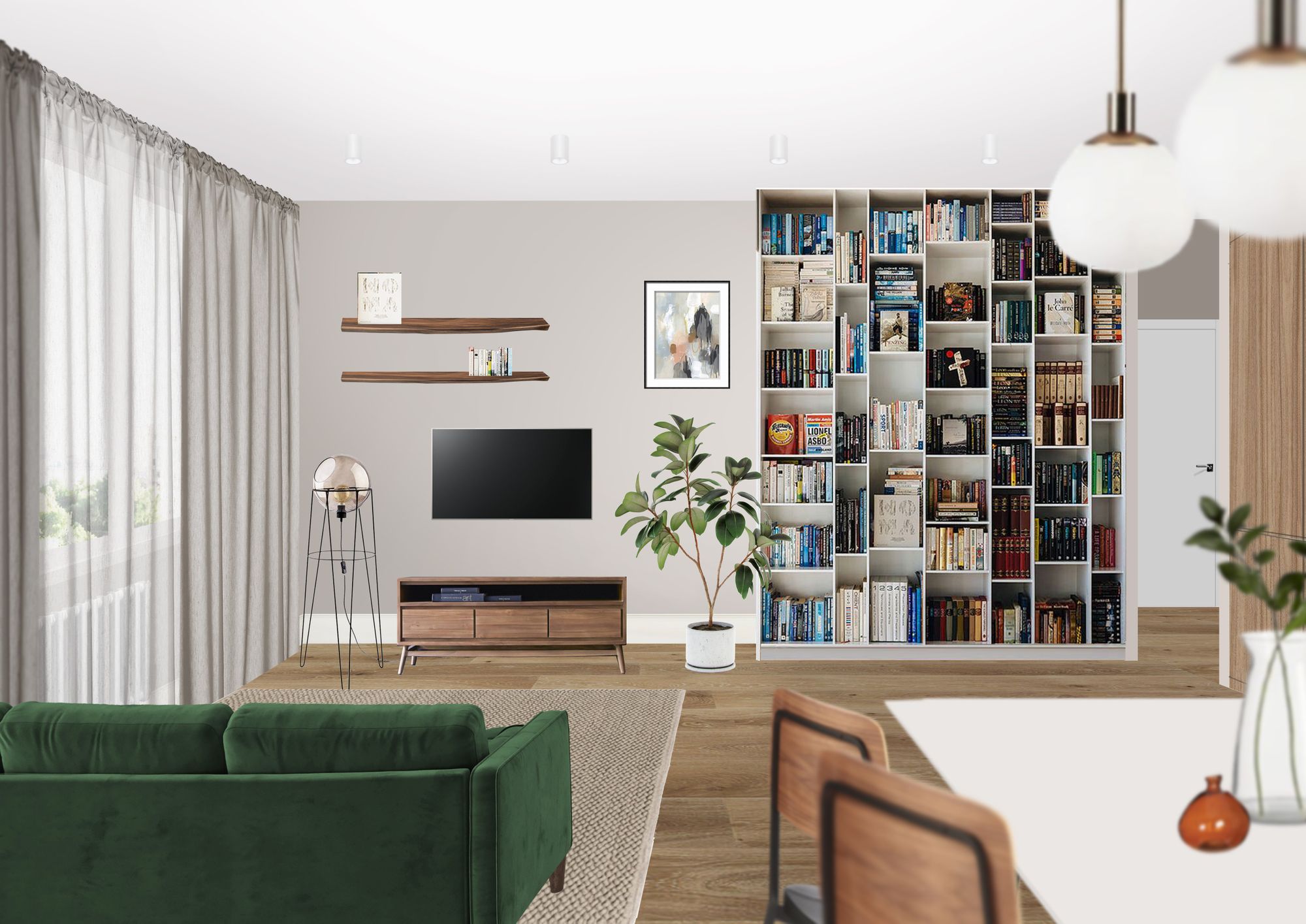 Напротив дивана можно разместить телевизор, который хорошо будет видно и с кухни и за обеденным столом.