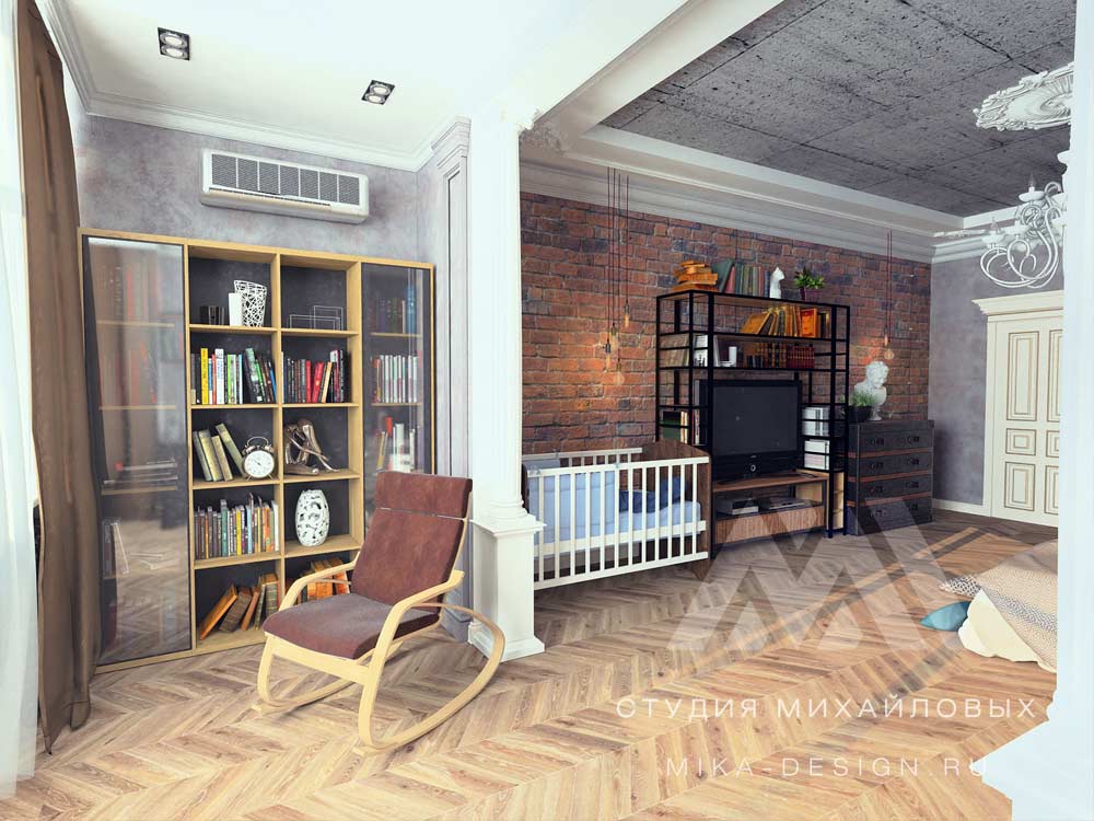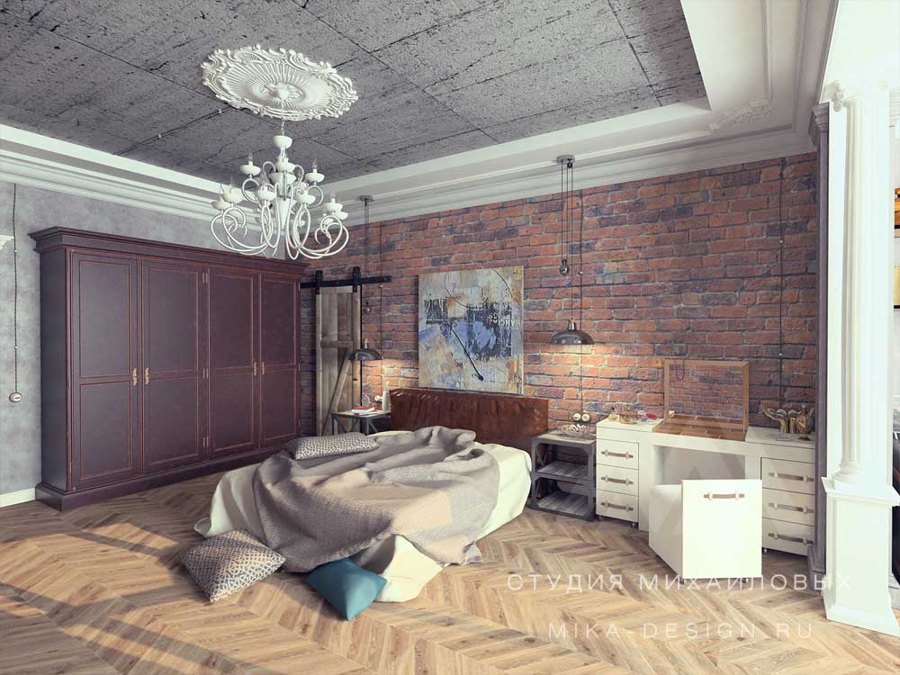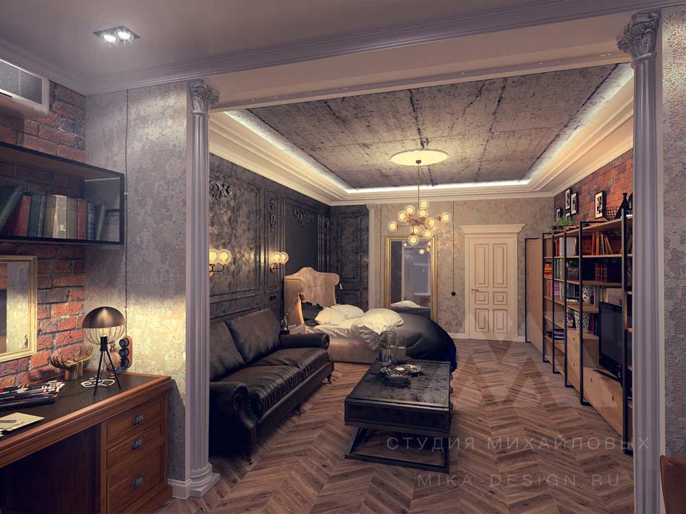 Спальня для гостей оформлена в едином для всей квартиры стиле – сочетании лофта и классики. Однако здесь особенно заметно влияние готики: из-за большого количества бетона и классического лепного декора глубокого серого цвета пространство становится похоже на интерьер старинного каменного замка.