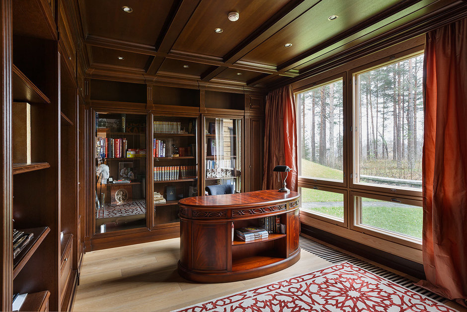 Для оформления окон кабинета используют легкие занавеси и тяжелые шторы в тон мягкой мебели.