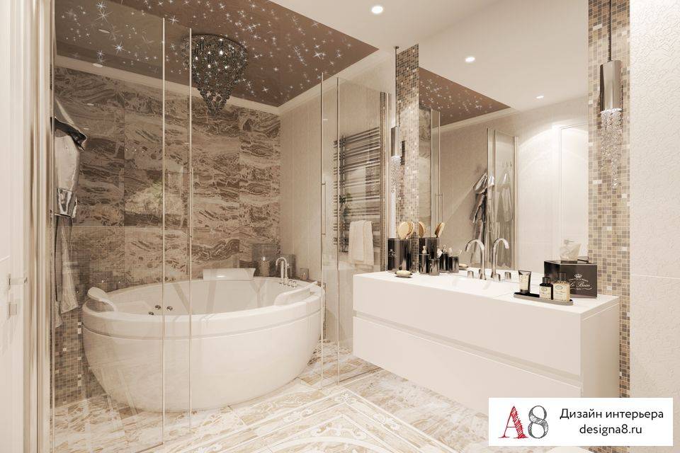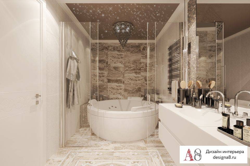 Классический дизайн ванной комнаты совмещает элегантность и простоту. В этом проекте удалось использовать практичные решения и внедрить оригинальные идеи, например, сделать натяжной потолок со звездным небом в зоне ванной.