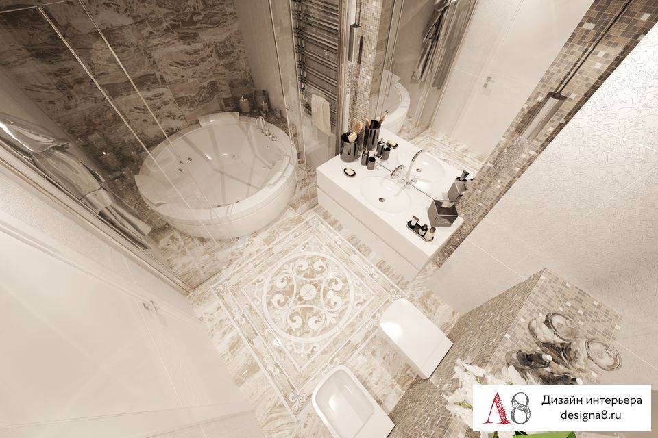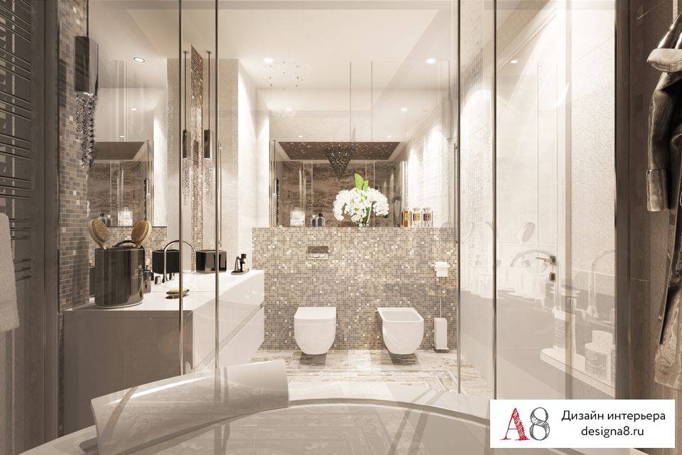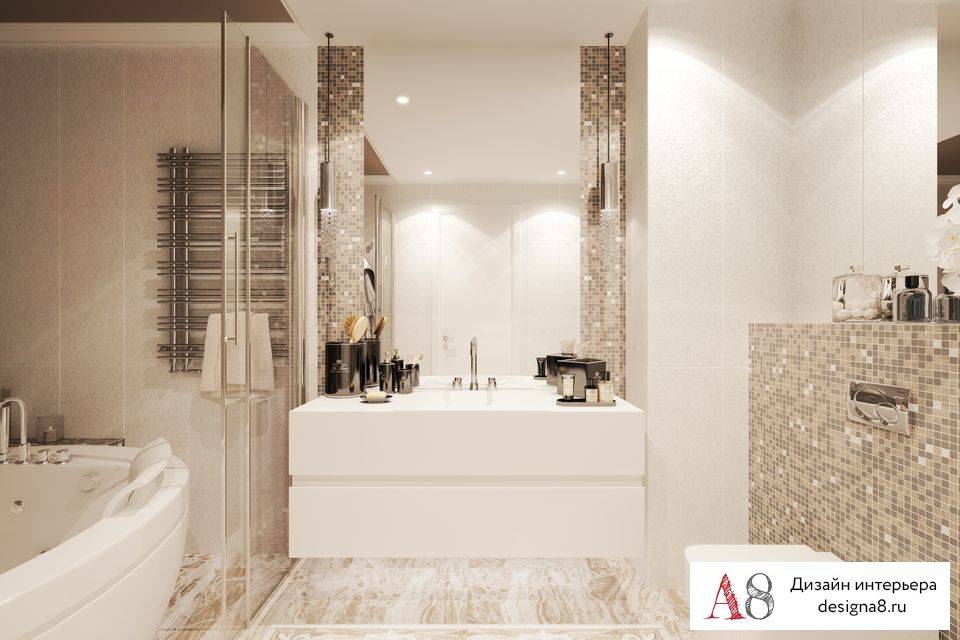 Напротив входа в помещение размещена раковина с зеркалом. Роль освещения играют полупрозрачные свесы с небольшим хрусталем, расположенные по бокам. Для отделки этой зоны использована мозаика (Китай), подобранная под цвет камня и рисунок фоновой напольной плитки. Также этой мозаикой обшит изоляционный короб под биде и туалет.