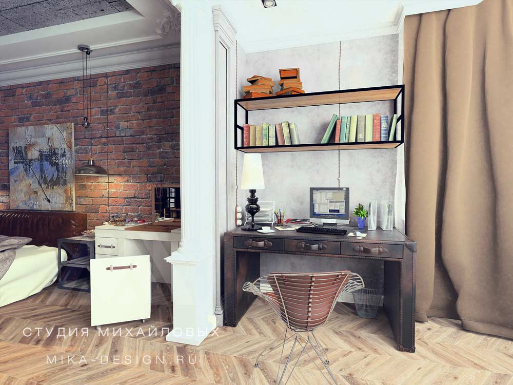 В комнате могут размещаться полки под канцелярские принадлежности или целая библиотека, поэтому здесь будут уместны стеллажи и застекленные шкафы.