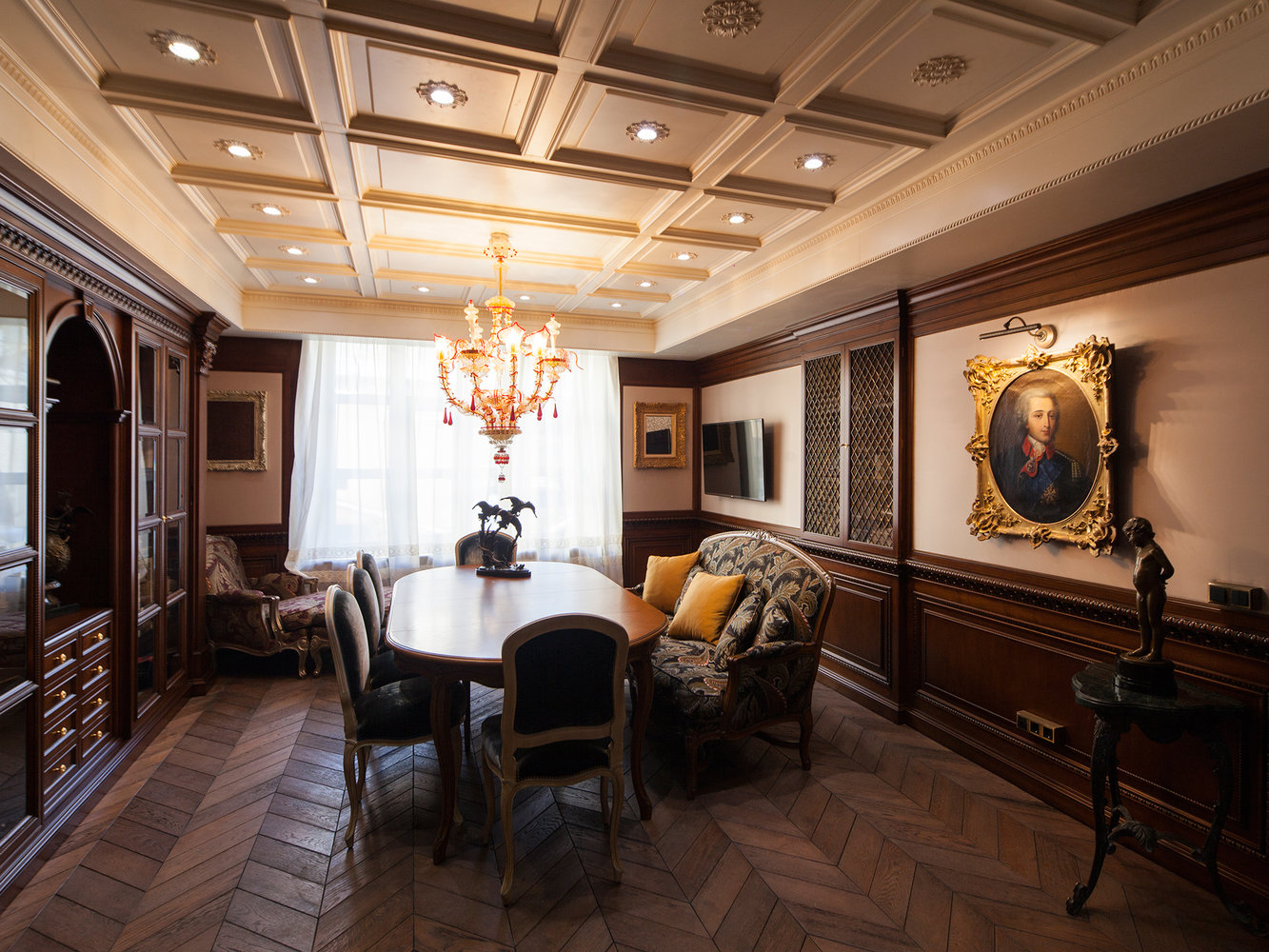 Умиротворённая аристократическая обстановка не может утомить или надоесть, её освежают и разбавляют новыми экспериментами. Оформление обернётся существенными финансовыми затратами, но это сторицей окупится актуальностью и длительной эксплуатацией вещей.