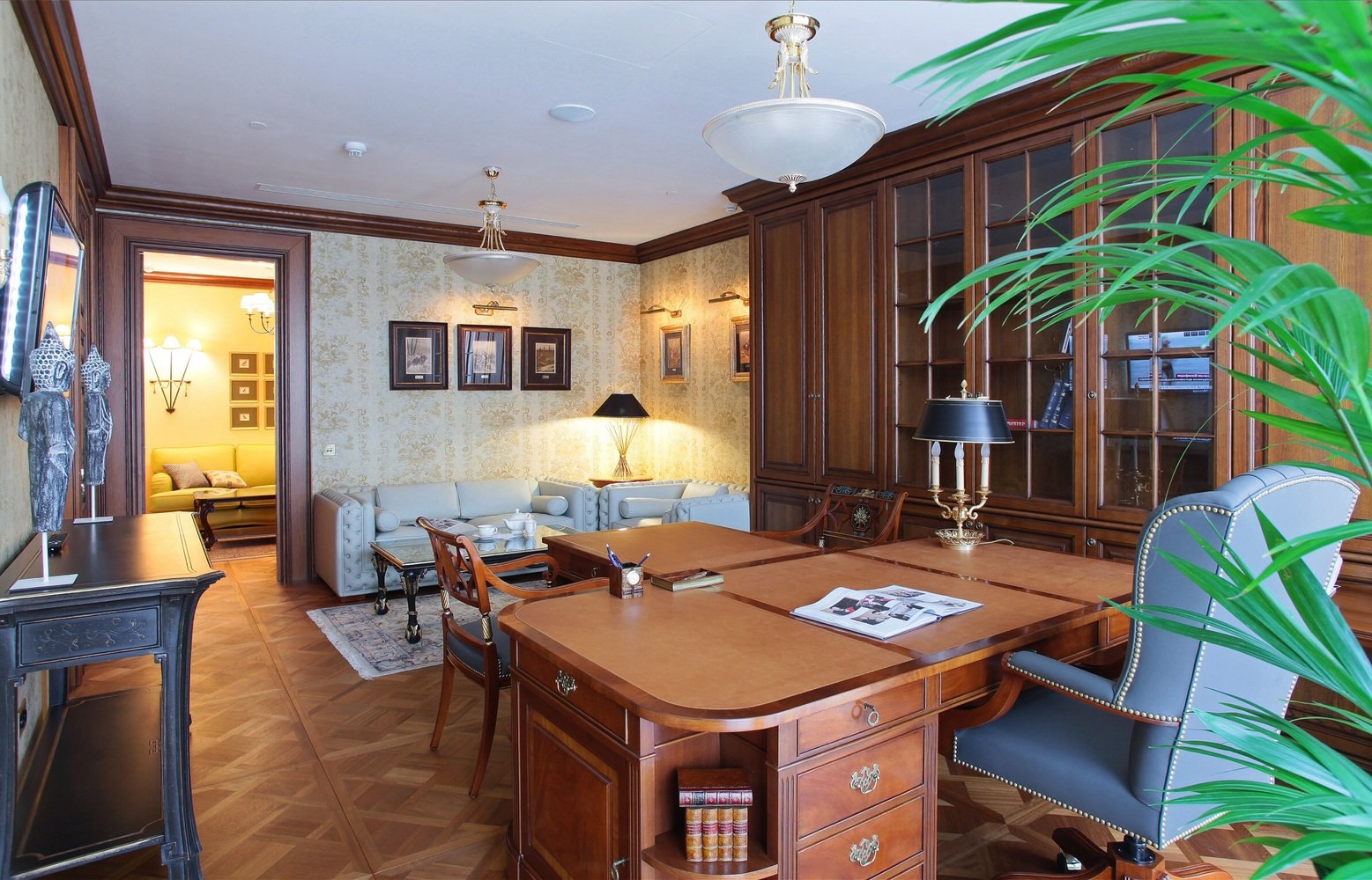 В формировании спокойного интерьера, настраивающего на рабочий лад, отлично подходит классика. Лаконично выглядят кабинеты в коричневых тонах, от нежного крема до шоколада. Темная мебель выглядит презентабельно, хорошо смотрятся диваны «под кожу».