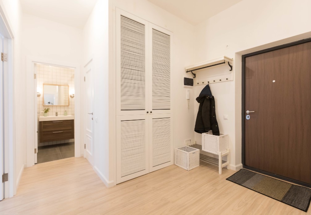 В квартире рекомендуется расширить узкий коридор, выполнив перепланировку. В этом случае в коридоре можно будет обустроить удобную гардеробную комнату. Также гардеробную можно разместить в спальне.