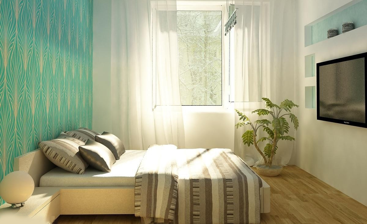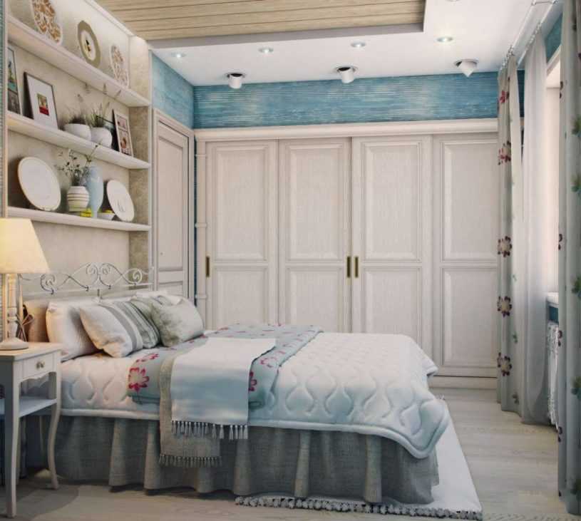Воссоздать простор, можно с помощью отделки окна в белом или нежно — голубом цвете. В маленьких комнатах лучшим решением будут светлые гардины, они визуально увеличат размер спальни.
