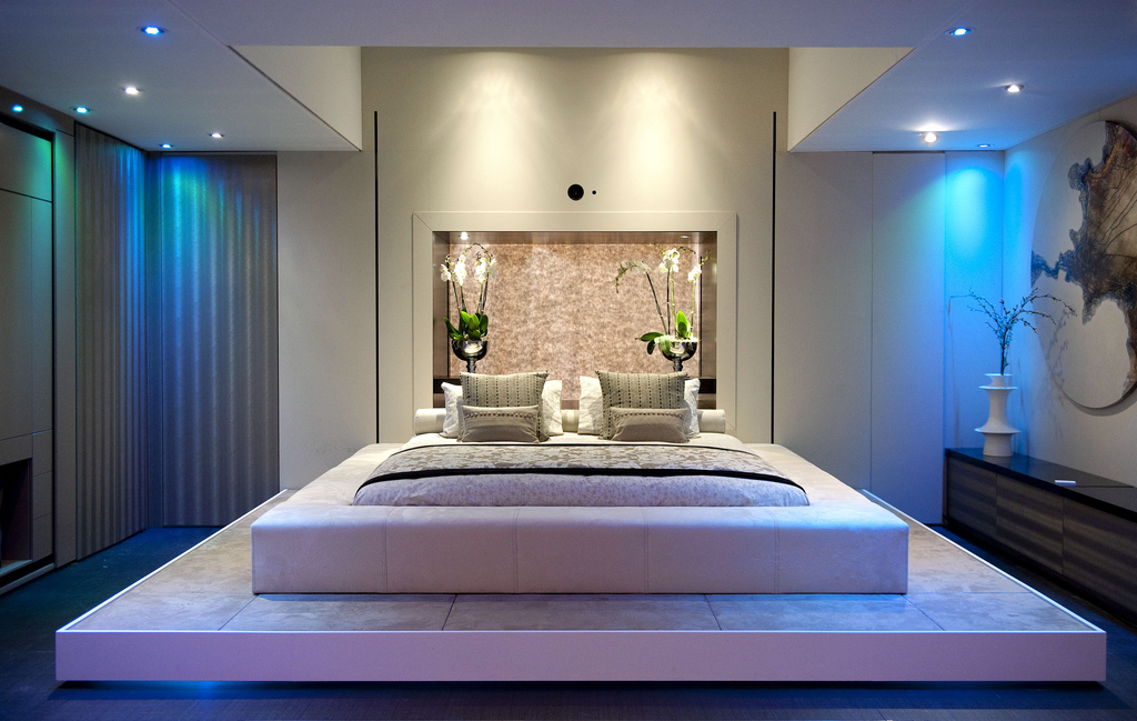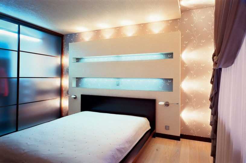 Более уместны здесь оказываются светодиодные подсветки, бра и различные прикроватные светильники на тумбочках, позволяющие при необходимости легко создать непринужденную интимную атмосферу.